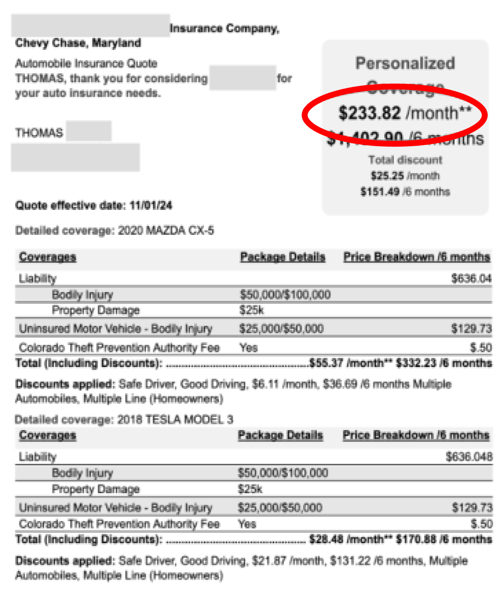 He first went to a well-known insurance company's site. After filling in the information for his Tesla and his wife's Mazda, he got a quote of $233.82/month for both cars.